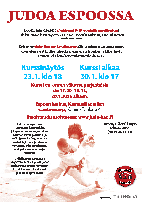 Kevään 2026 alkeiskurssi alkaa 30.1.2026!23 elo, 2021 Tule judonäytökseen 23.1.2026 klo 18.00 Kannusillanmäen väestönsuojaan! Ilmoittaudu tästä!